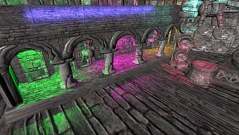 - per-pixel lighting and shadowing for multiple point light sources done as a fullscreen post process