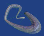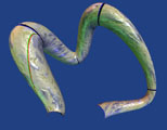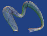 - each section of the base spline is tesselated by a section of a displaced, scaled and twisted cylinder